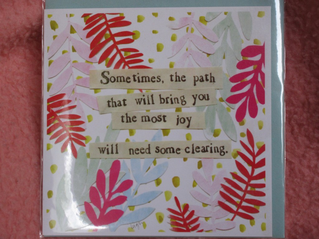 I once bought a card that said, “Sometimes, the path that will bring you the most joy will need some clearing.” I still have that card, sitting on my desk in full view. But now I might add, “Sometimes the path you are already on will need some clearing!”